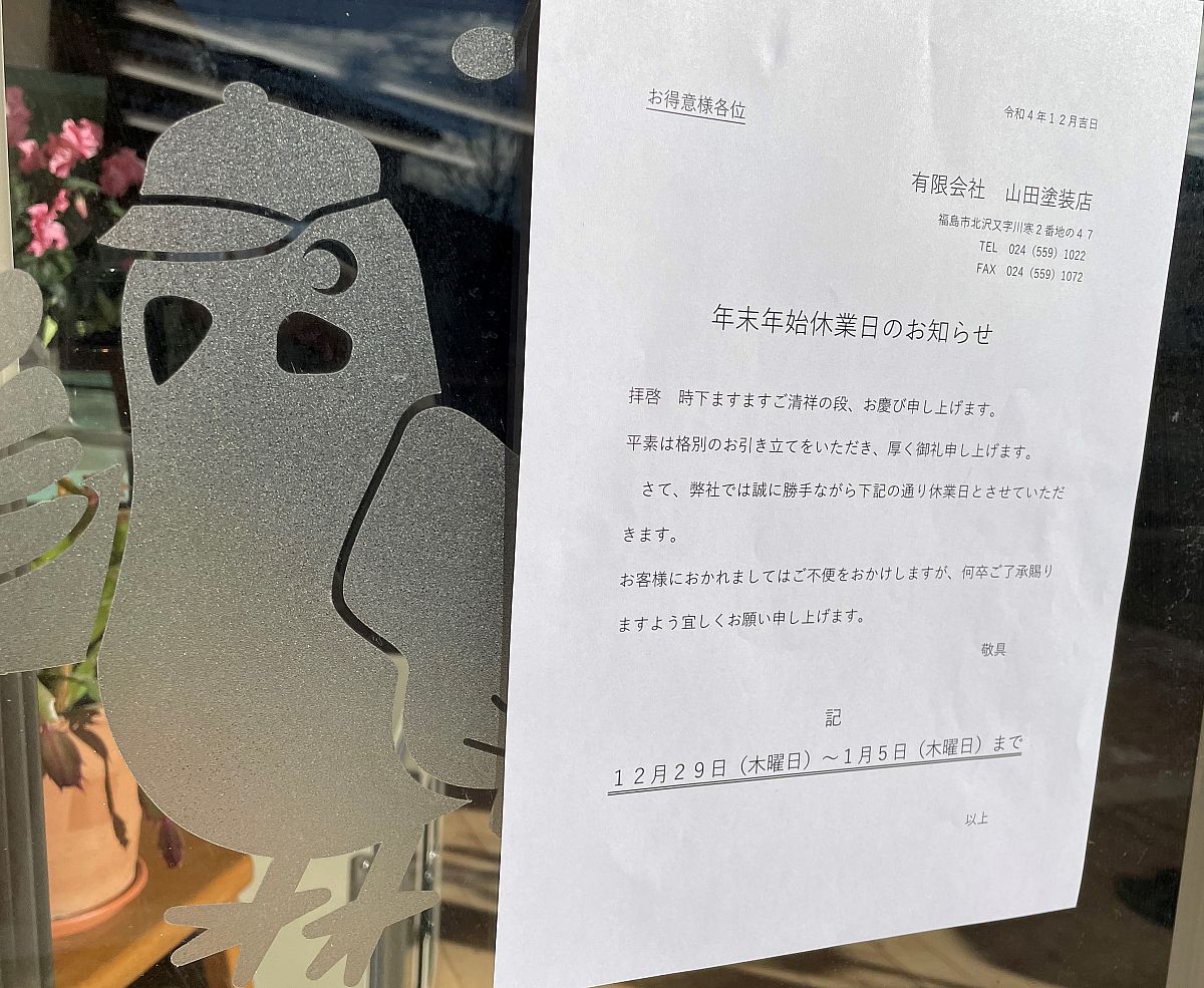 こんにちは!山田塗装店スタッフです♪今年も残す所あと3日!!1年あっという間でした~(^^;)さて当社ですが、12/29(木)~1/5(木)までお正月休みとなります!何かとご不便お掛け致しますがよろしくお願い致します。1年を通して沢山のお客様のお家の塗替えやリフォームなどに携えたこと嬉しく思います!来年も山田塗装店をよろしくお願い致します!(^O^)