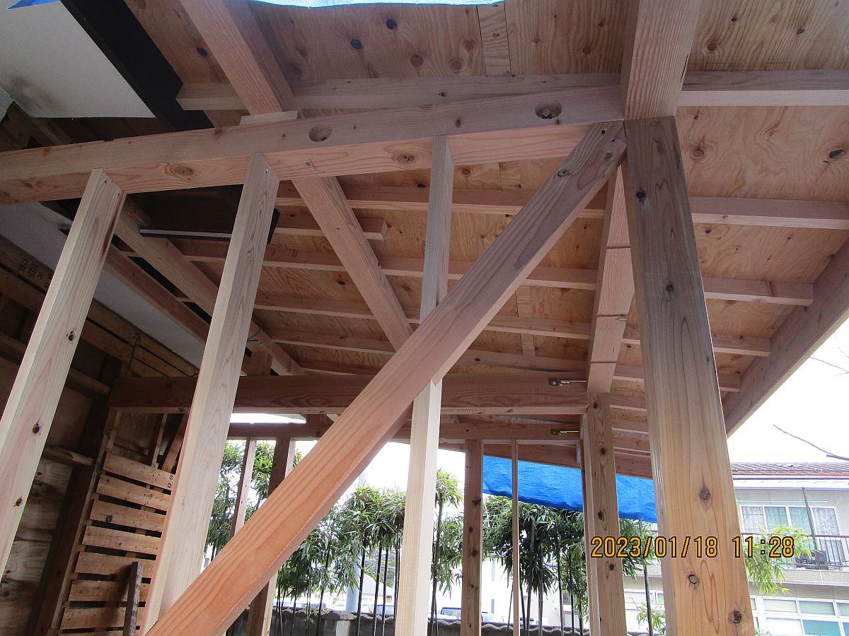 こんにちは!山田塗装店ピーちゃんです!!!本日、一部増築のお客様の骨組みが完成したピヨ~!(^_-)-☆大工さんお疲れピヨ!こちらのお客様は既存のお部屋を広くするのに増築!!元々のお部屋も増築部に合わせて床・クロス・天井を変えられます!新しいお部屋が楽しみピヨヽ(^。^)ノ