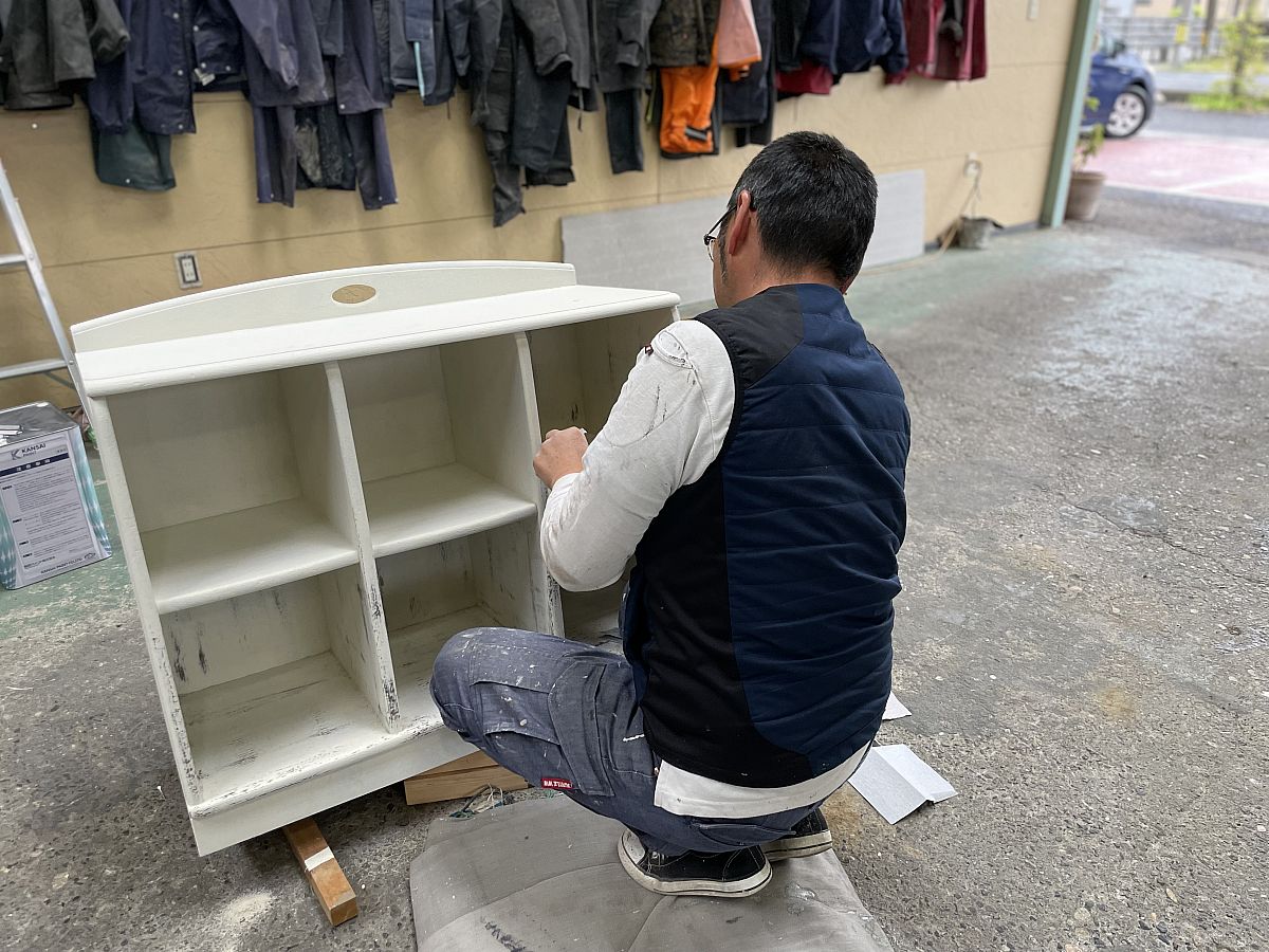 皆さんこんにちは!山田塗装店のピーちゃんです!!今日は一日中雨(~_~;)倉庫をのぞいてみたら工事部長が棚の塗装をしていたピヨ~!なんとこれ、棚の塗装をアンティーク調にする為にヤスリをかけているところなんです(^○^)地道な作業、根気がいる作業...チラッと仕上がりが見えますね!完成が楽しみだピヨ( *´艸`)