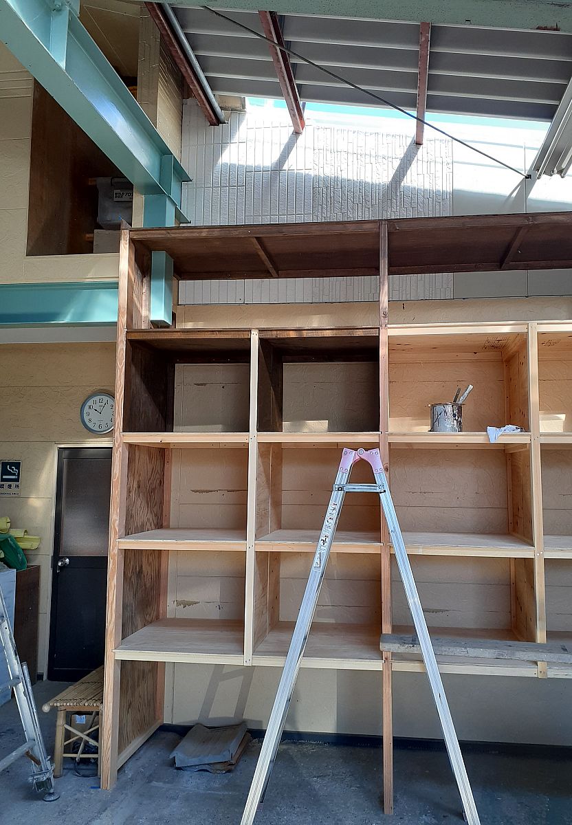 倉庫内の棚も改装中!みなさん、こんにちわ!