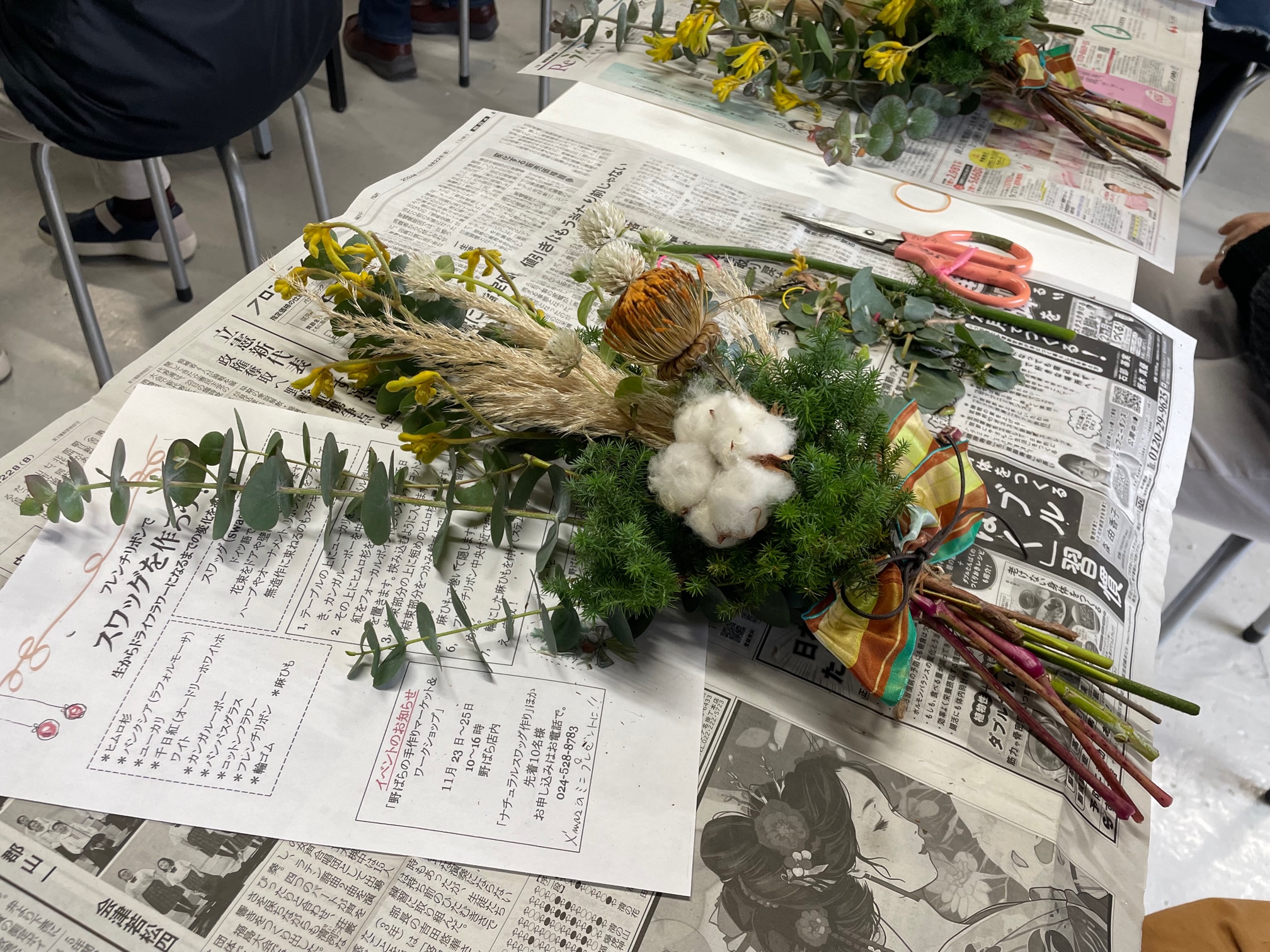 こんにちは!土曜日はフラワーアレンジメント教室と相談会ありがとうございでした!!沢山の方にご参加頂き、皆さんスワッグ作りを楽しんでくださったようで良かったです(^_-)-☆雑貨やお花の苗の販売もあり、皆さん子いすや本入れ、他にもお買い上げありがとうございます!皆様のお家のインテリアの仲間入りですね(^^)/♡次回は来年の春に開催予定ですので、皆様のご参加をお待ちしております!始めましての方も先生が分かりやすく教えてくれるので安心してご参加ください(^^ゞ
