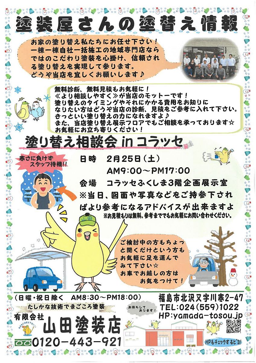 こんにちは!山田塗装店スタッフです!過ぎてしまいましたが、、コラッセにて相談会開催しておりました(^_^)/来て下さった皆さんありがとうございます♪塗装の目安は?ここ大丈夫?など些細なことでもお客様それぞれのお家にあったものをご提案させて頂きます!次回の相談会もよろしくお願いします(*_ _)