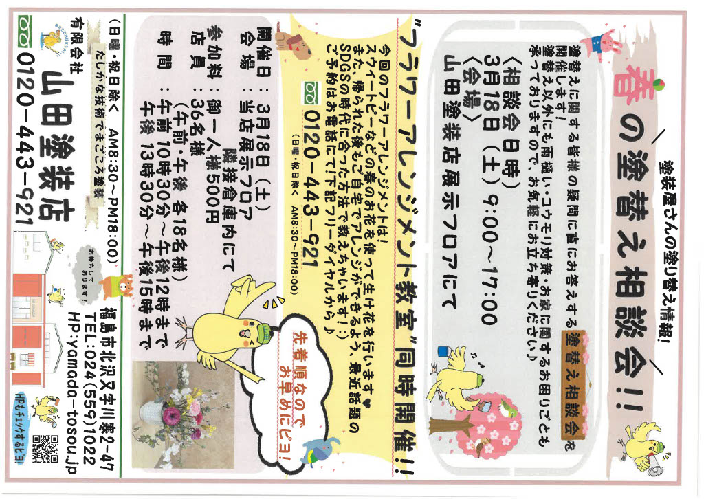 皆さんこんにちは!山田塗装店のスタッフです!!明日はついに春の塗替え相談会と同時にフラワーアレンジメント教室が開催されます♡実際にお花屋さんと教室を開かれている先生をお招きしてアレンジメントをしていくので初めてでも安心です(*´ω`*)完成したものはお持ち帰りが出来ます!!まだ空いてます!!先着順なのでお早めに~~!!!!!