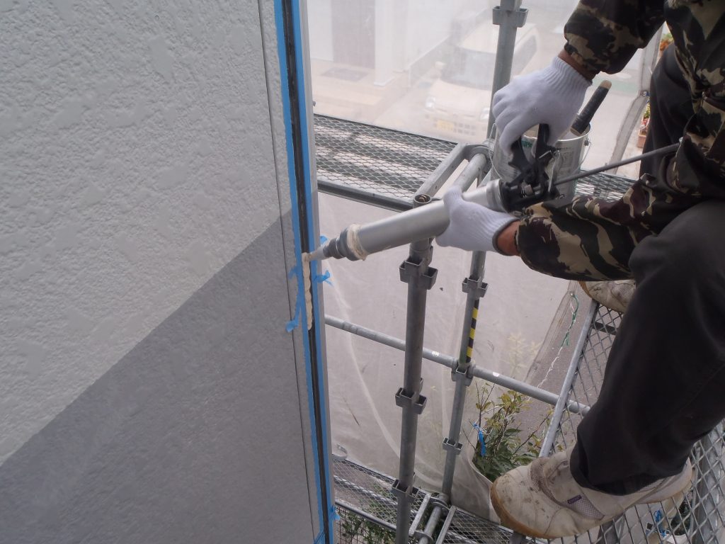 外壁サイディングの目地シーリング部分は劣化すると外壁防水性能を著しく低下させますので塗り替え後の重要な工事と位置付けております。
