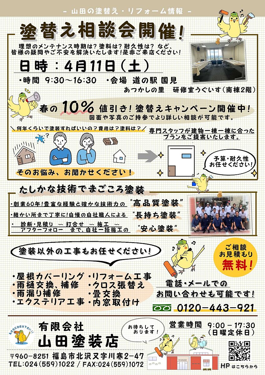 4月11日(日)に道の駅国見さんにて相談会を開催いたします!😌💡会場はいつもと同じく南棟2階の研修室うぐいすとなります。当店事務所が福島市にありますので、伊達市や伊達郡の方はいつもより足を運びやすいこの機会に是非ご相談ください😊✮*。゚また、春の塗り替えキャンペーンはご好評頂いております10%値引きとなっております!100万の工事であれば10万お値引き!大変お得です!!!🫢会場でお待ちしております!